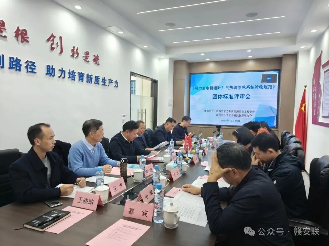 2025年12月19日,江西省水力和新能源发电工程学会联合江西省公共安全科技创新联合会在南昌组织召开了《风力发电机组叶片气热防除冰系统验收规范》团体标准评审会。评审会邀请了高校、科研院所、用户单位及标准化领域的资深专家进行评审指导。