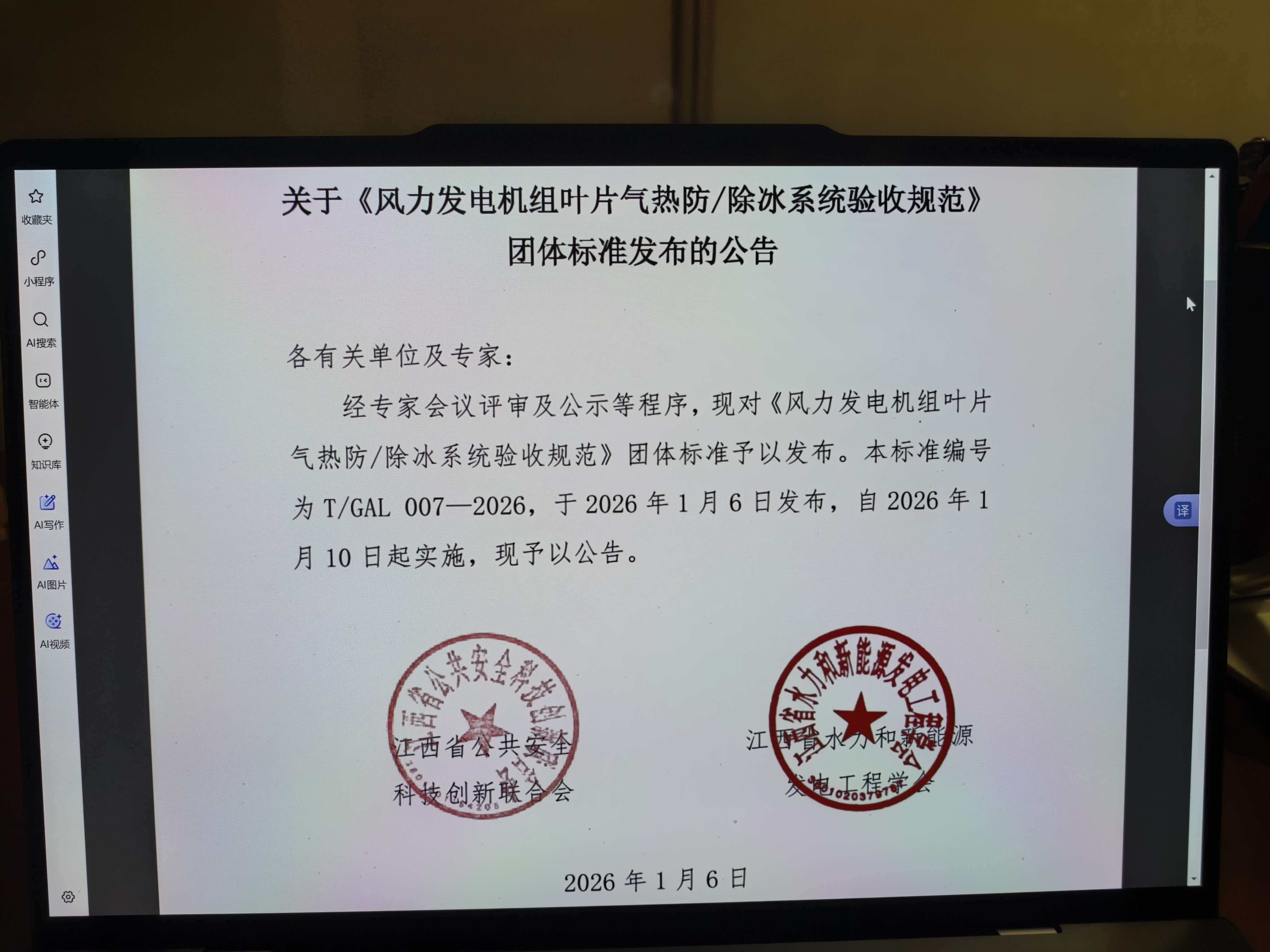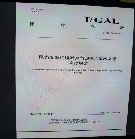 2026年1月6日,由我学会和江西省公共安全科技创新联合会联合研制的T/GAL007-2026《风力发电机组叶片气热防/除冰系统验收规范》团体标准在全国团体标准信息平台正式发布,这标志着水新学会的标准化研制工作迈出了可喜的第一步。