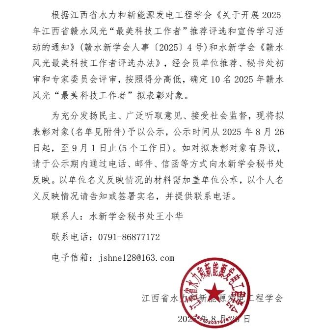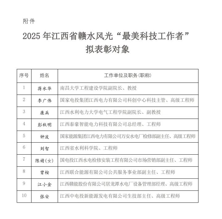 江西省水力和新能源发电工程学会关于 2025 年赣水风光“最美科技工作者”拟表彰对象的公示